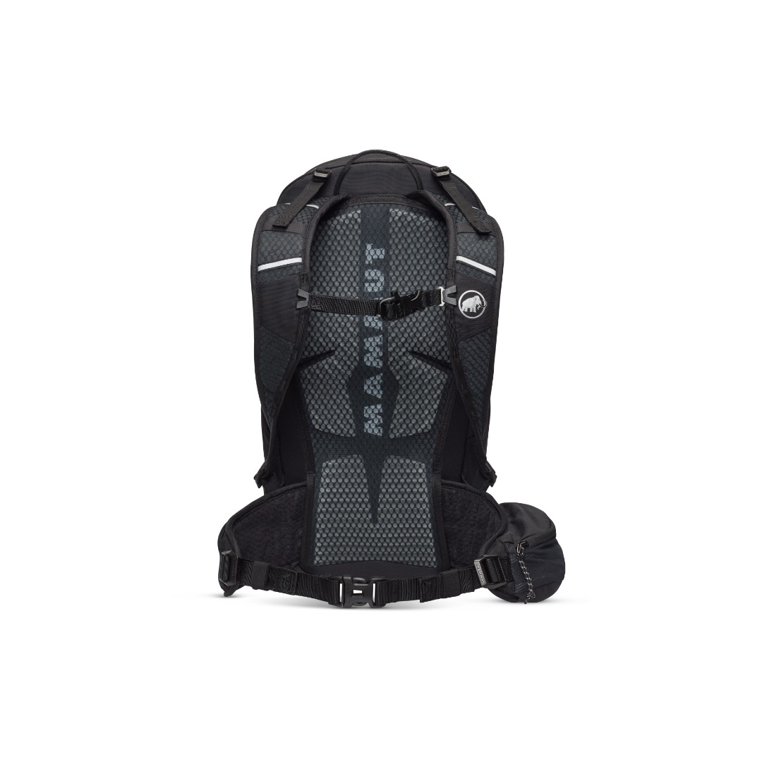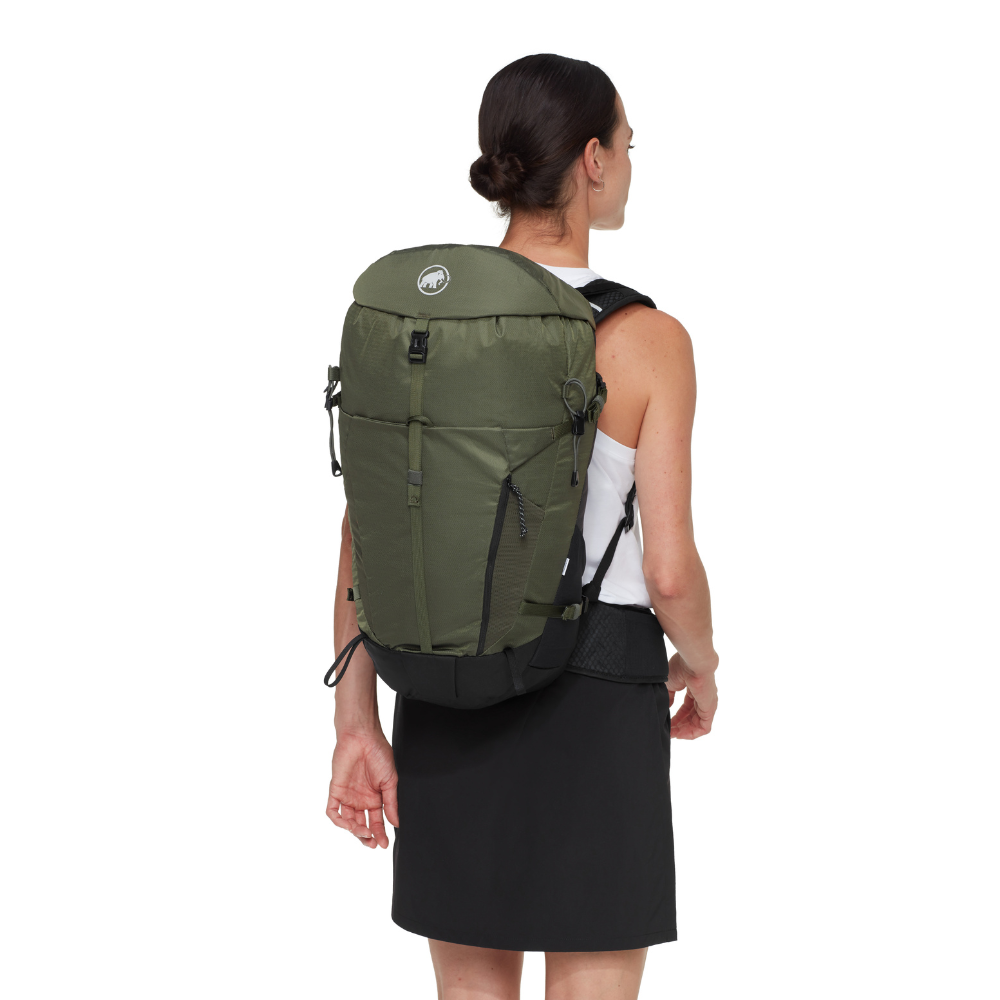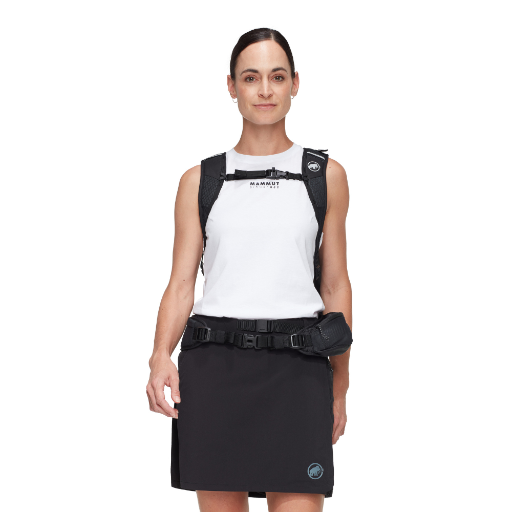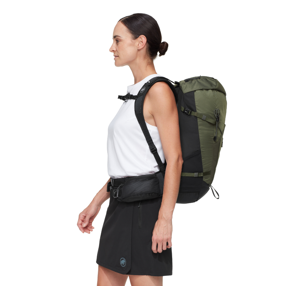 You feel equally at home on relaxed hikes or demanding tours. So does the Lithium 25 Women. It is made mainly from recycled materials and the durable water-repellent treatment is PFC-free. The carrying system and shoulder straps are specially designed for the female anatomy. The very lightweight and breathable shoulder padding ensures additional comfort. Air channels in the 3D EVA foam provide good ventilation. The padded hip belt has a fold-out pocket for your smartphone. If you don’t need it, you can simply remove it. The same applies to the integrated rain cover. The Lithium 25 Women is compatible with hydration systems. The mesh side pockets allow access even when walking. A flexible and versatile companion for your trips to the mountains.