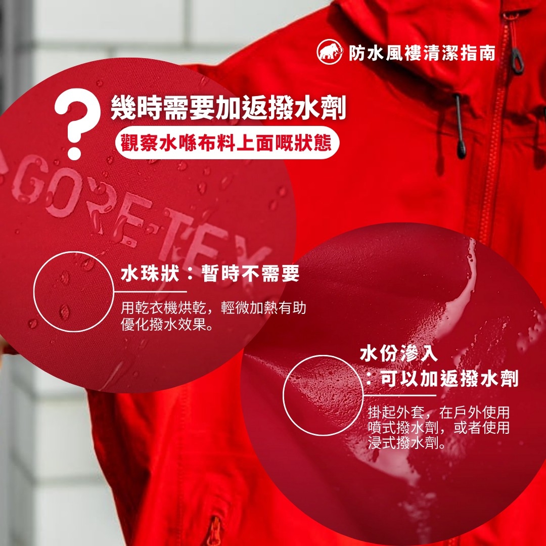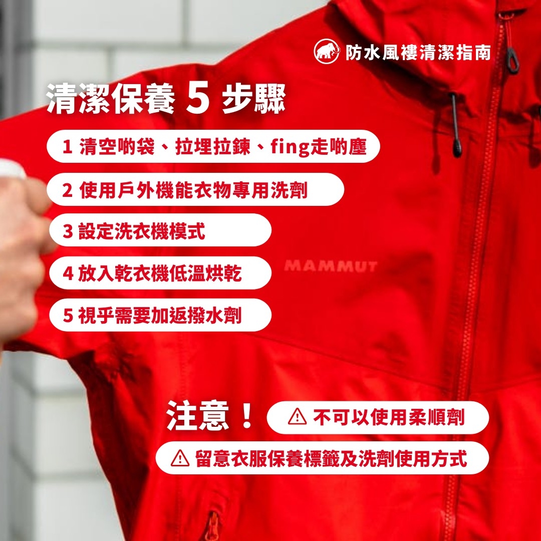 1. 切記清洗防水風褸過程,絕對唔可以用柔順劑,因為柔順劑會封住布料上嘅微小孔洞,將會嚴重影響防水風褸嘅透氣功能。