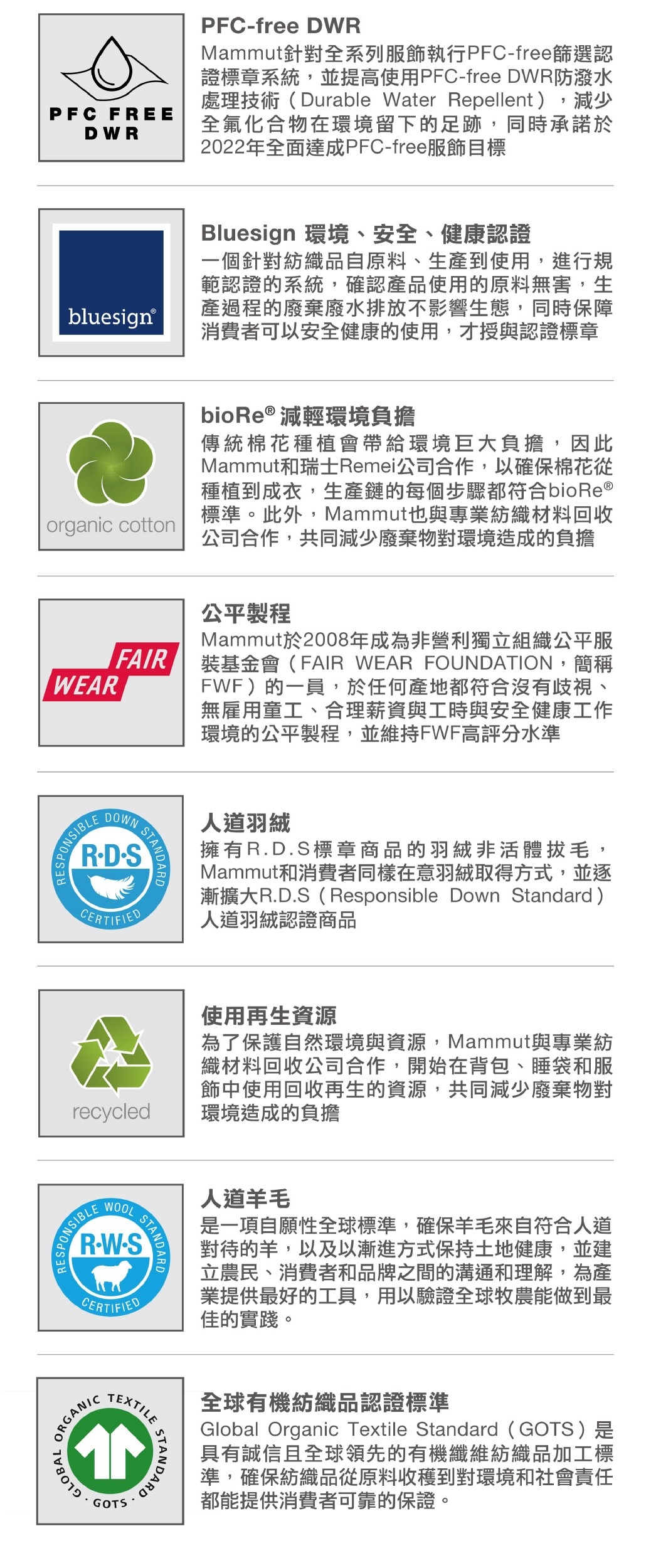在世界自然基金會(WWF) 公布的2017年環境評等與創新報告中,Mammut擠身中小企業和瑞士企業的榜首,這是Mammut自2008年以來,與FAIR WEAR、Bluesign、R.D.S等夥伴共同努力的成果。